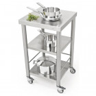 Stainless steel kitchen cart with two shelves underneath and no drawer. The working top of stainless steel is very robust and resistant. A cart without a drawer is optimized for maximum storage. Ideal for your outdoor environment as work station/ trolley alongside your grill. This kitchencart is suitable for the interior and outdoor use.